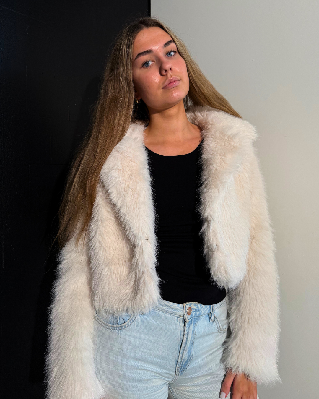 Lisa oma garderoobi luksuslik aktsent selle pehme ja stiilse lühikese kasukaga. Kreemikat tooni kunstkarusnahk loob elegantse ja trendika ilme, sobides ideaalselt nii pidulikeks sündmusteks kui ka igapäevaseks kandmiseks. Klassikaline avatud esiosa ja mugav lühike lõige teevad sellest universaalse rõiva, mida saad kanda nii kleidi kui ka teksadega.