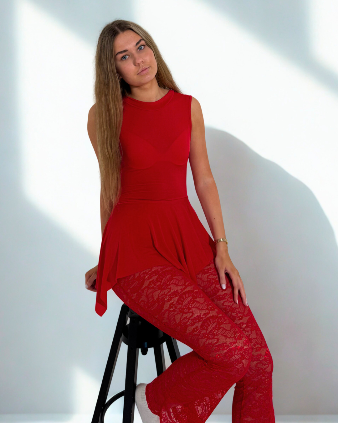Naiste punane pitsiline pükskostüüm