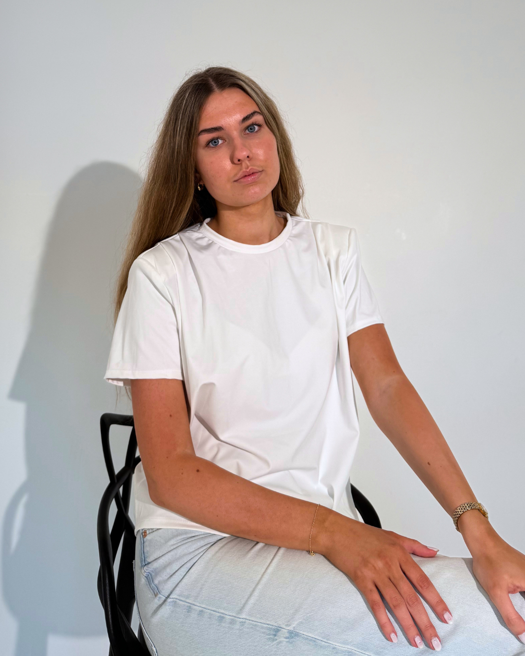 Naiste valge õlapehmendustega t-särkNaiste valge õlapehmendustega t-särk